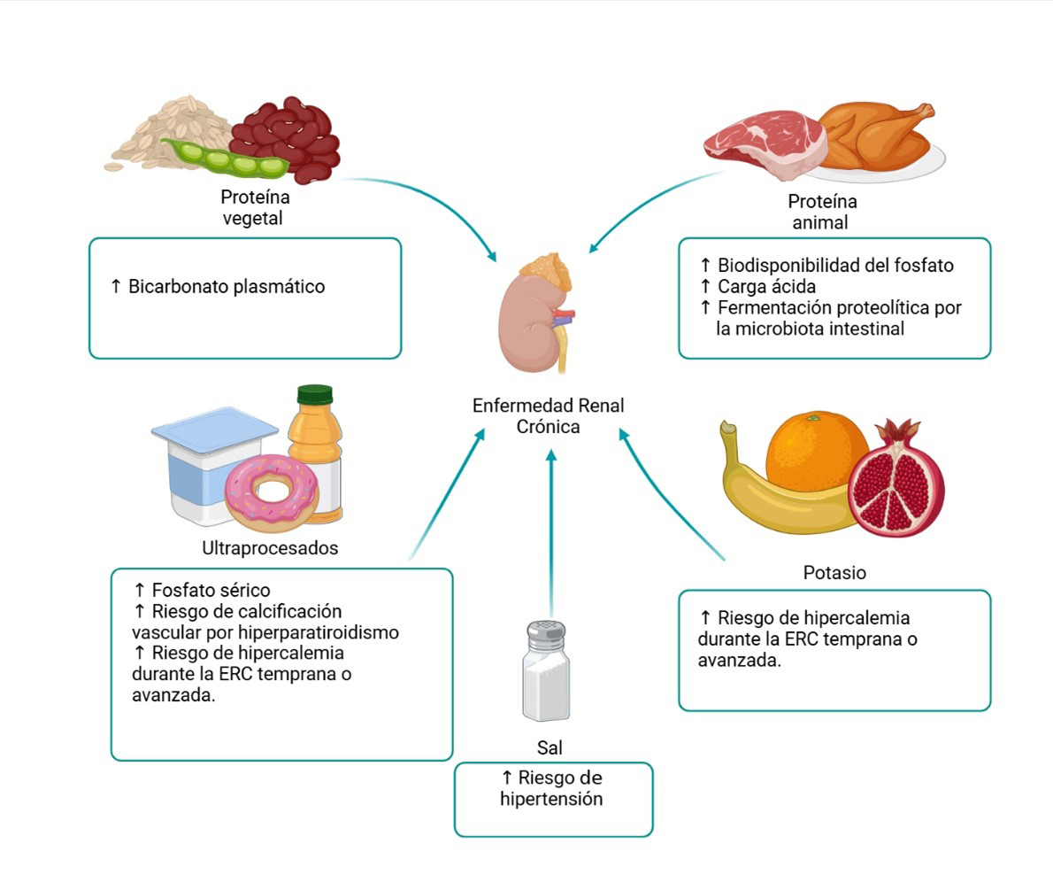 La acidosis metabólica suele ser común en pacientes con erc y da como resultado un bajo nivel de bicarbonato plasmático, un factor de riesgo para la progresión de la nefropatía. Por lo tanto, en el manejo nutricional de la erc es esencial adoptar patrones alimentarios que favorezcan la función renal y reduzcan la acidosis metabólica. Un enfoque basado en proteínas de origen vegetal, como leguminosas, frutos secos y semillas, puede contribuir a una mejor homeostasis metabólica, mientras que la reducción de alimentos de origen animal y ultraprocesados minimiza la exposición a sodio, fosfatos añadidos y grasas trans, factores que pueden acelerar la progresión de la erc.